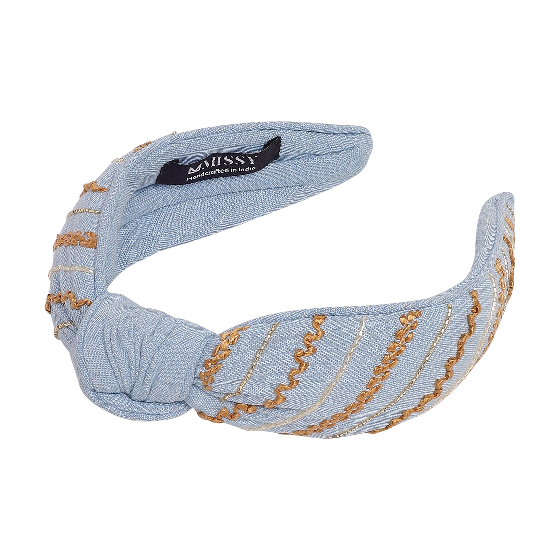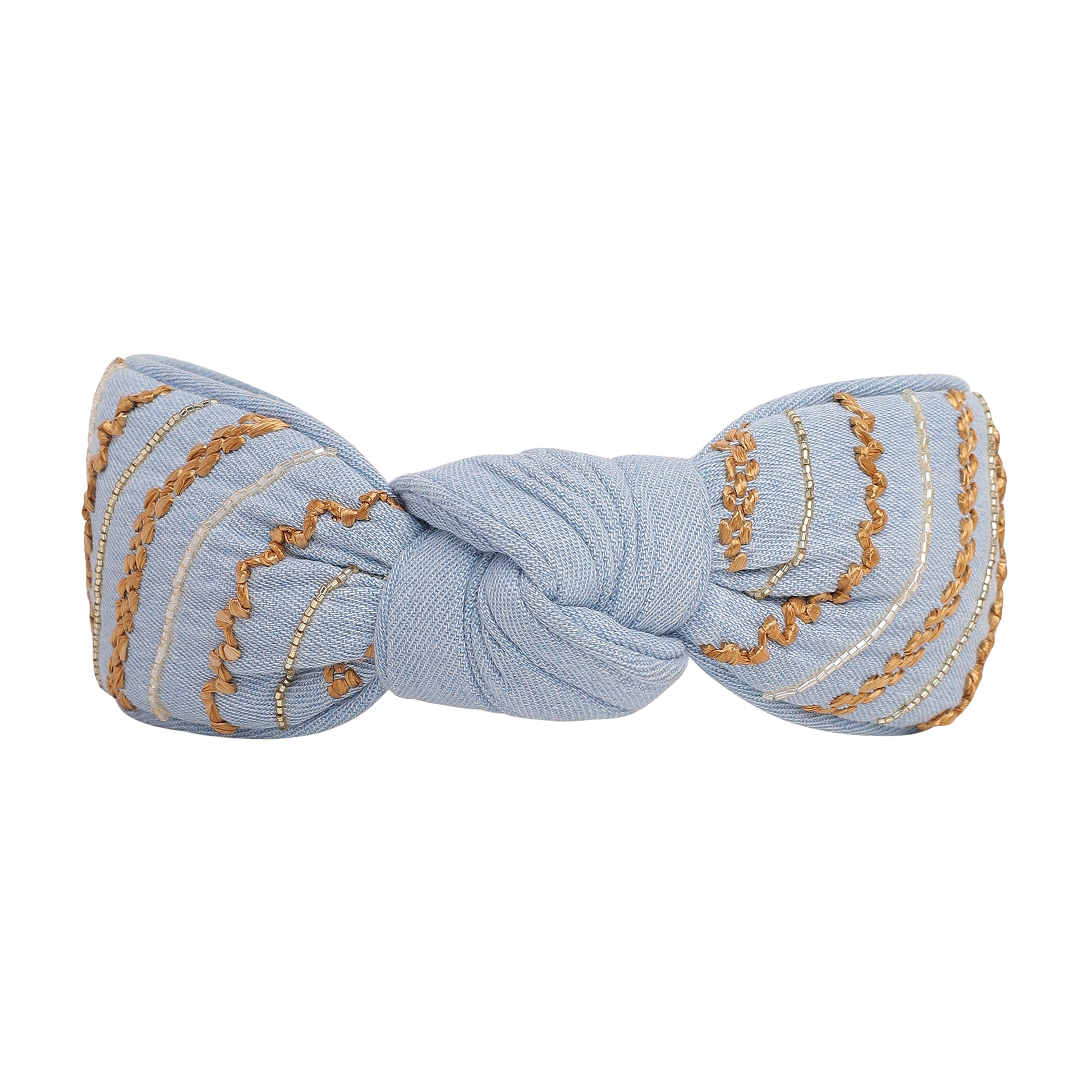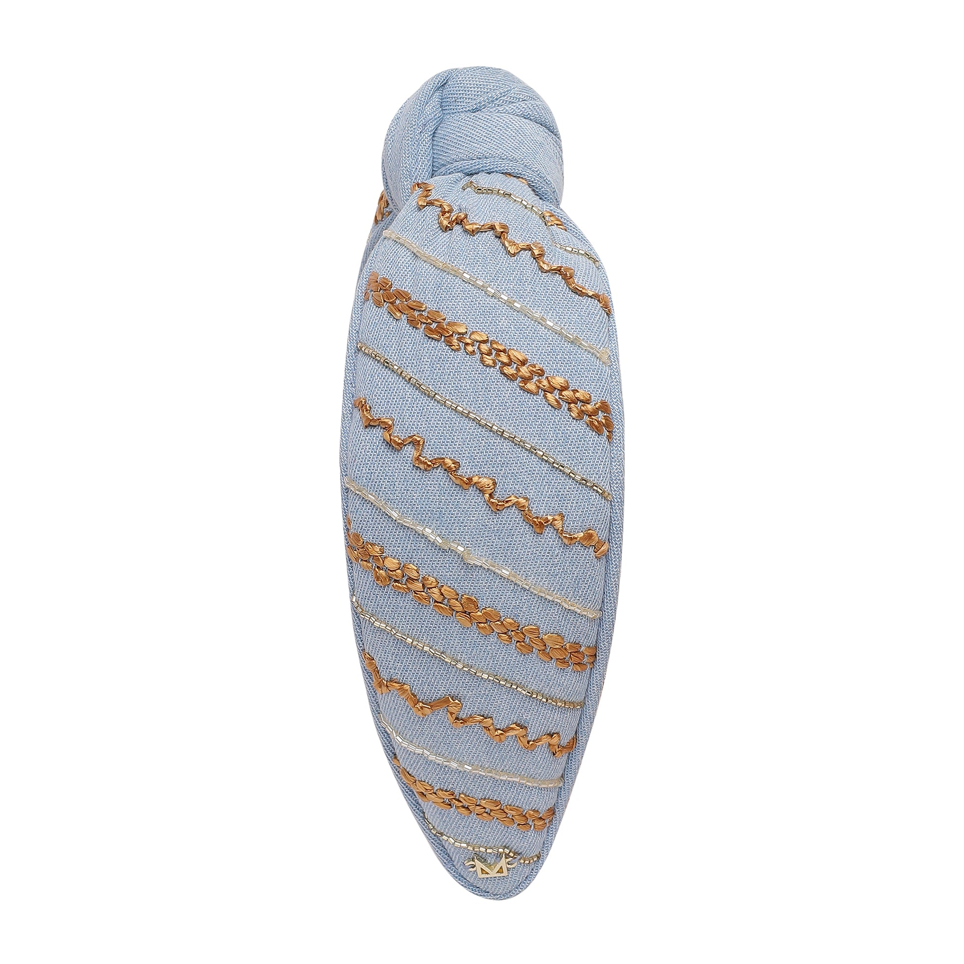 Elevate your style and comfort with our handcrafted Pillowtalk knotted puffed headbands. Made from luxe denim, this headband is adorned with stunning gold and silver threadwork. With its playful knot and lightweight feel, it is the perfect accessory to elevate your day-to-night style.