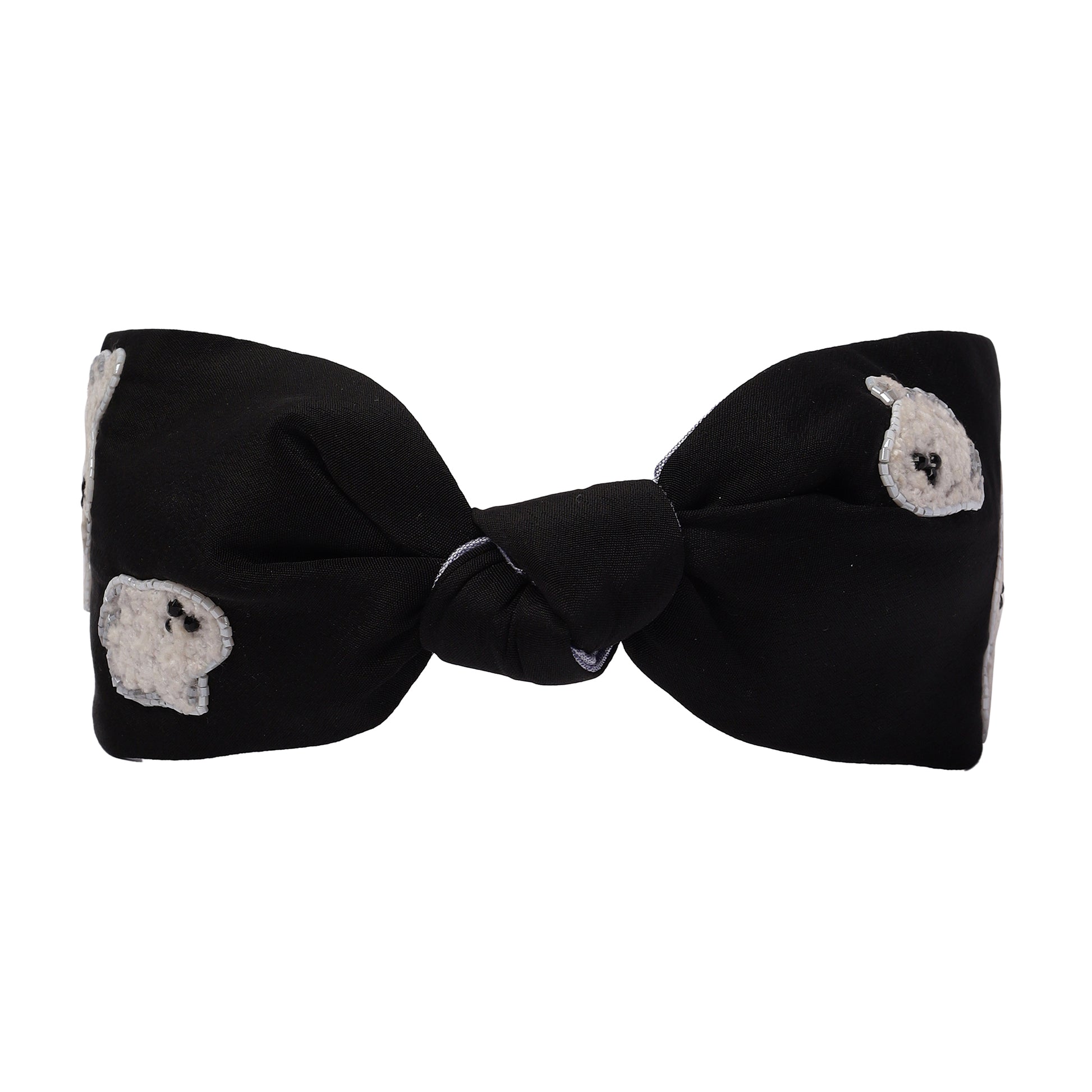 Embrace the fun side of spooky with our handmade knotted headband, crafted in striking black and white and embellished with playful little ghosts. The monochrome palette makes it fashion-forward, while the ghost motifs and delicate embellishments lend just enough Halloween whimsy. Lightweight and comfortable, it’s designed as a statement piece you can flaunt during trick-or-treating without missing a beat.