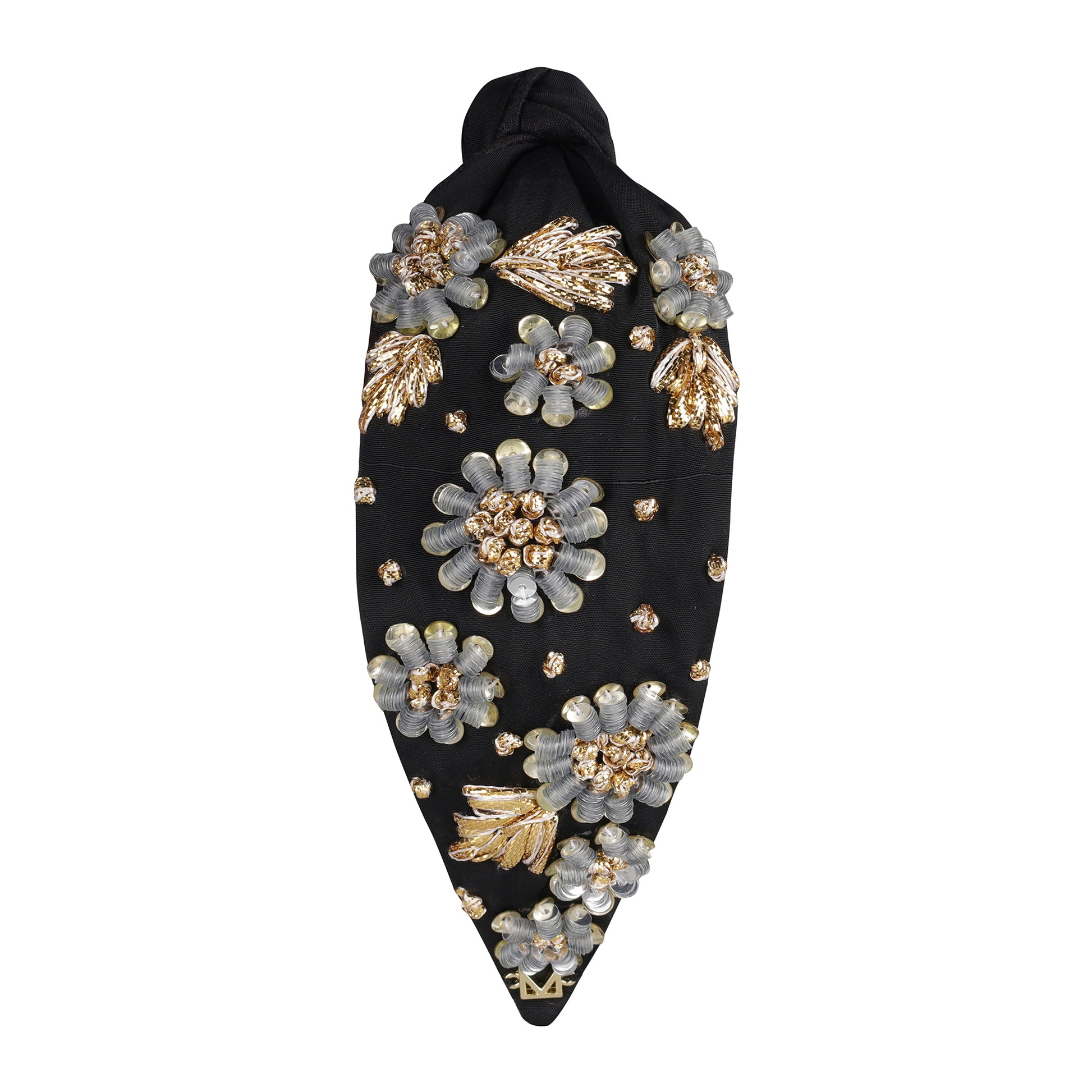 An incomparable poise, this knot ties up silhouettes of bold, opulent garlands. This headband illustrates celeste blue with the Midas touch that, when crowned on your ensemble, will be a showstopper.